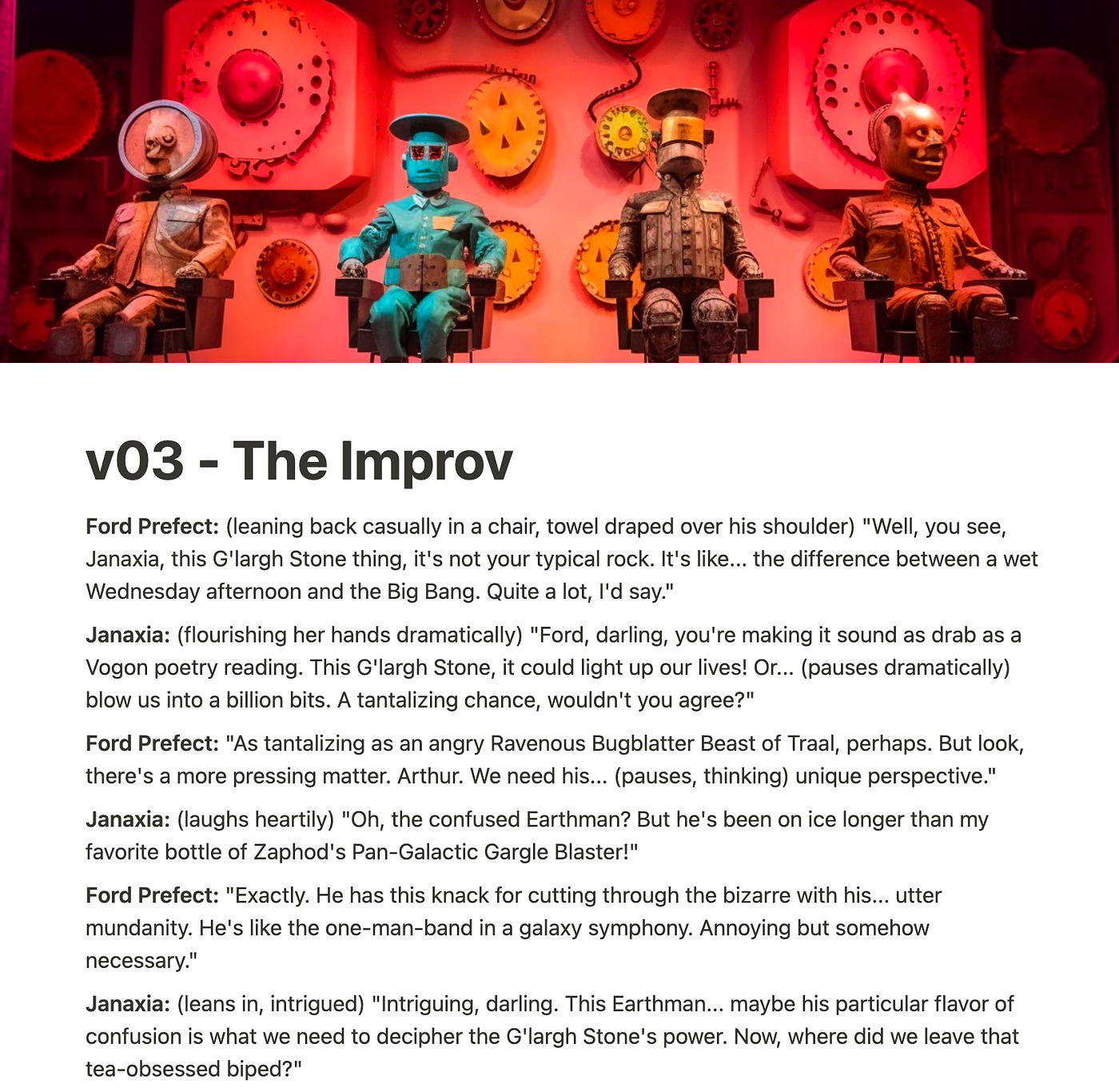 One of the apparent shortcomings of AI produced narrative seems to be character dialogue. Some people have posted ‘AI written’ stories which are purely exposition, and about as exciting as reading the IMDB plot summary. As I listened to the original radio version of Hitchhiker’s and compared it to the chapter created by AI, I realized how much of the original story is dialogue between the characters — very little actually happens in a given scene.